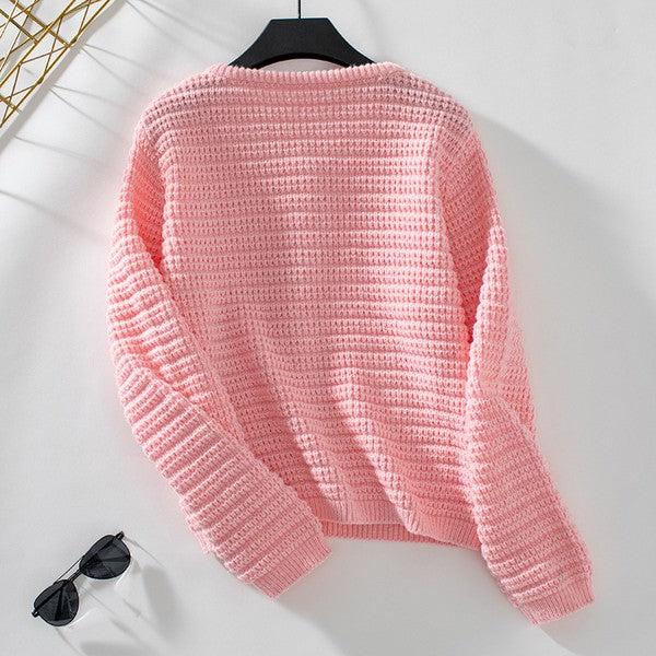 Dating in pink sweater exudes a gentle, feminine charm with its delicate hue and cozy design. The light, blush pink color provides a fresh, airy feel, while the brown printed buttons add a touch of earthy warmth and contrast. These buttons, featuring a unique pattern, create a subtle yet stylish detail that enhances the overall look without overpowering the soft tone of the sweater. Perfect for layering or wearing on its own, this piece effortlessly combines comfort with a refined, casual elegance. Ideal for pairing with jeans or skirts, it’s a versatile addition to any wardrobe looking to blend warmth, color, and texture.