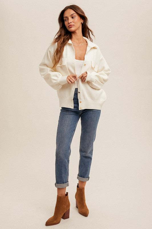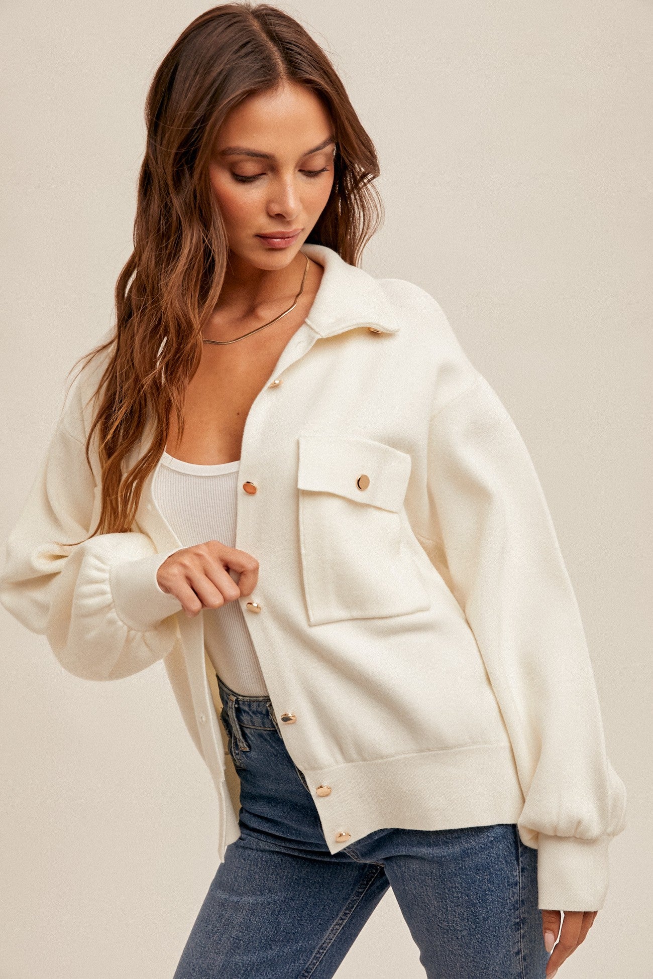 Elevate your outerwear collection with our Ivory Button Down Bomber Jacket. This stylish piece features a classic bomber silhouette enhanced by elegant button details for a chic twist. Crafted from high-quality materials, it offers a soft and comfortable fit, perfect for layering. The neutral ivory hue makes it versatile, allowing you to effortlessly pair it with anything from casual jeans to tailored trousers. With ribbed cuffs and a relaxed fit, this jacket combines modern flair with timeless appeal. Stay cozy and chic in this must-have bomber that’s perfect for any season!